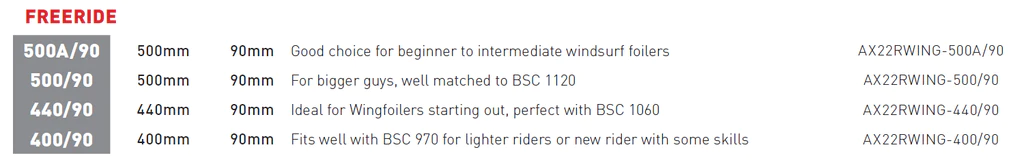 Axis Freeride Carbon Rear Wing Set. These wider chord wings are the perfect choice for beginner wingers, windsurfers and SUP foilers. The design emphasis is on easy lift, stability and predictable turning. The 440/90, paired with our BSC 1060 front wing, is the popular choice for learning to wing foil.