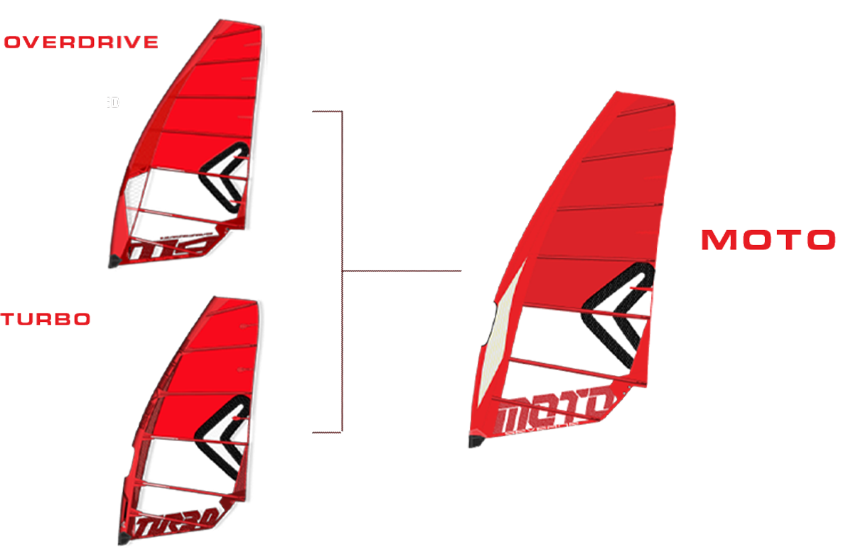 Severne Moto Windsurfing Sail 2024. The Moto morphs two sails into a single sail that transcends performance boundaries.