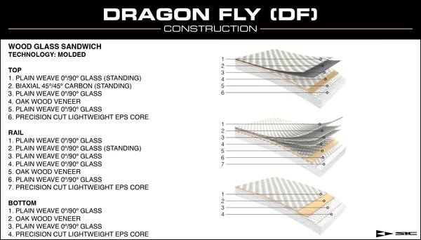 DRAGON FLY (DF) is constructed with a lightweight EPS core that is sandwiched top and bottom with an oak wood deck and bottom laminate, which is then wrapped in fiberglass for superior stiffness, durability, and performance.